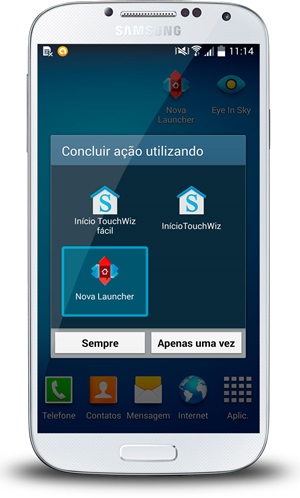 O primeiro passo é aplicar o launcher como inicialização padrão do Android. Toque o botão Home, selecione o aplicativo e marque a opção “Sempre”, para que a interface seja acessada toda vez que você voltar para a homescreen.