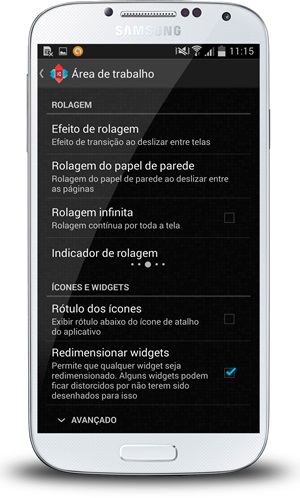 - Em “Ícones e Widgets”, desmarque a opção “Rótulo dos ícones” — que esconde o nome de cada atalho, deixando o visual mais limpo.