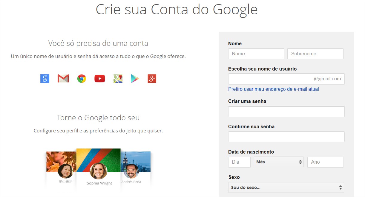 Se você já usa o Gmail, YouTube (efetuando login) ou outros serviços da empresa (até mesmo quem usava o Orkut tem uma conta Google), basta informar seu email e senha.