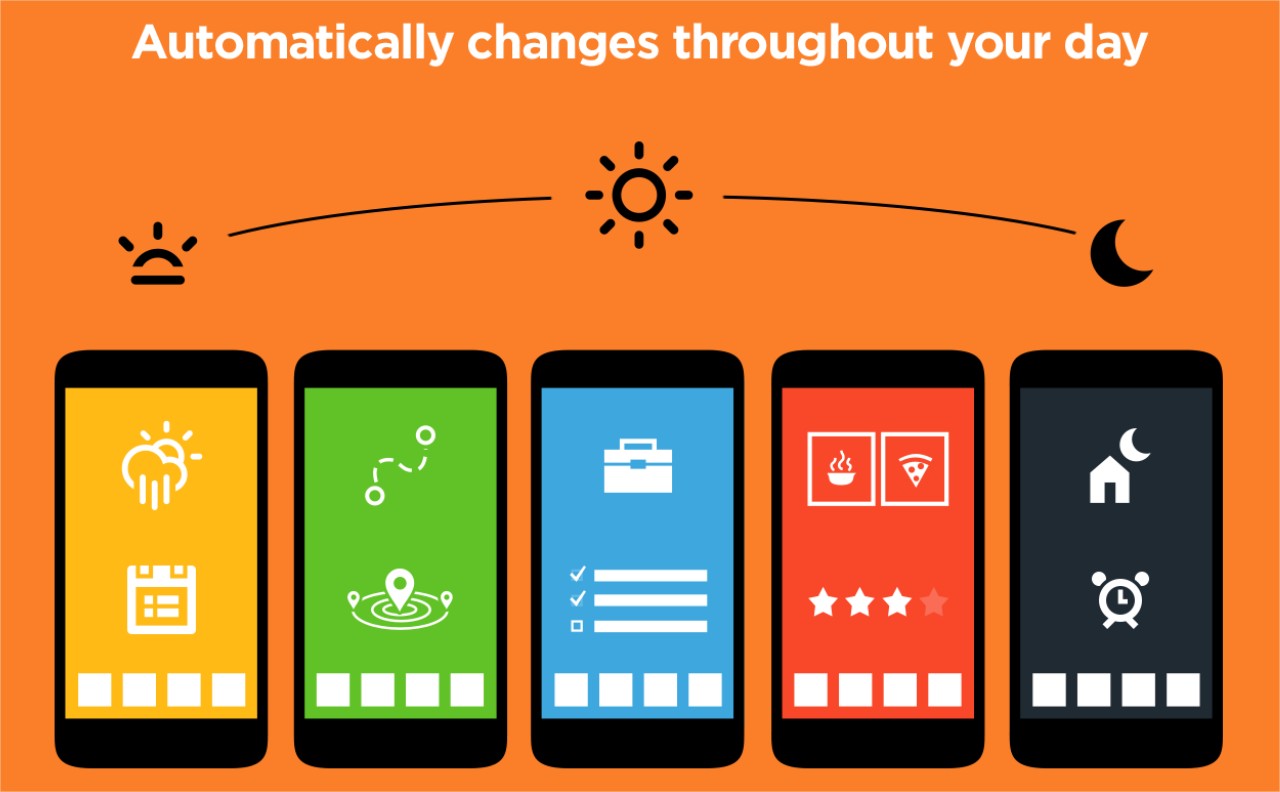 Está no trabalho? O Aviate oferece atalhos rápidos para o Gmail e os apps que você usa neste ambiente. Vai para a casa de um amigo? Não tem problema, pois o Aviate automaticamente ativa atalhos para o Maps e outros programas úteis.