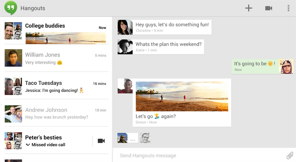O app oficial de mensagens da Google é ideal para centralizar mensagens de texto (SMS) e chats do Google+ em um único lugar. Ao lado esquerdo da tela, você pode encontrar seu histórico de mensagens. À direita, é possível acessar sua lista de contatos.
