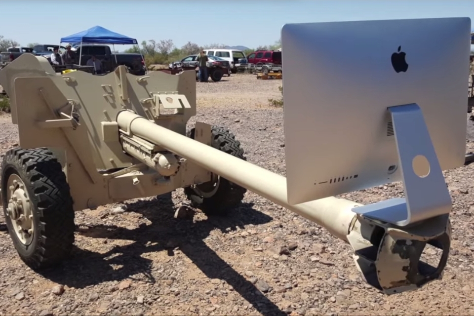 Feito para penetrar as resistentes armaduras de tanques de guerra, o armamento conta com munições de calibre 90 mm e certamente é capaz de destruir muito mais do que um simples computador – independentemente da marca. Ainda que a carcaça do iMac certamente não fique nada bonita depois do disparo, em câmera lenta é possível até considerarmos o momento bonito, como um show de fogos de artifício pra lá de caros.
