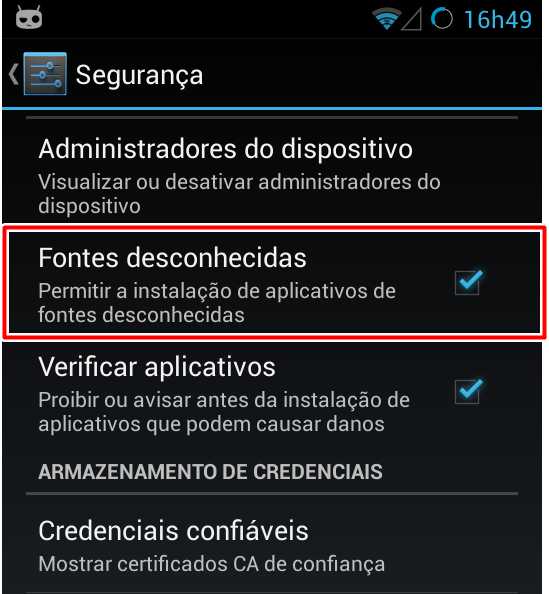 Em primeiro lugar, é necessário que você habilite a instalação de aplicativos de terceiros — ou seja: apps que não são oferecidos pela Google Play. Isso deve ser feito acessando as “Configurações”, depois “Segurança” e, por último, marcar como válida a opção “Fontes Desconhecidas”.