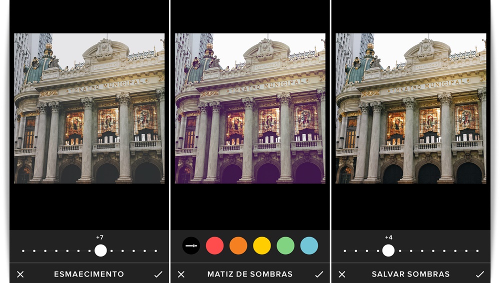 Outra boa ferramenta é o ajuste de matiz de sombras, penúltimo botão dos ajustes manuais. Ele aplica um discreto filtro colorido em toda a região mais escura da foto, ajudando a tonalizar o filtro que você escolheu. Por exemplo, se você achou o efeito escolhido muito frio, pode usar um roxo ou laranja nessa configuração para balancear isso.