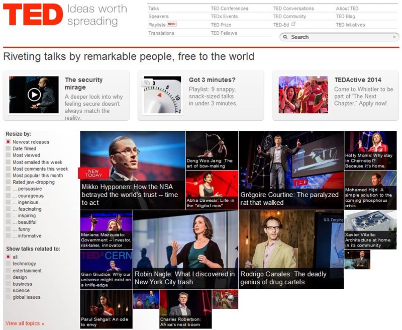 As conferências TED nasceram com foco em Tecnologia, Entretenimento e Design, mas hoje em dia você pode aprender sobre os mais diversos assuntos da contemporaneidade. Há palestras gratuitas com os principais nomes do mercado, com pessoas que se tornaram referências em seus campos de trabalho. Os materiais podem ser assistidos online ou baixados através do iTunes.