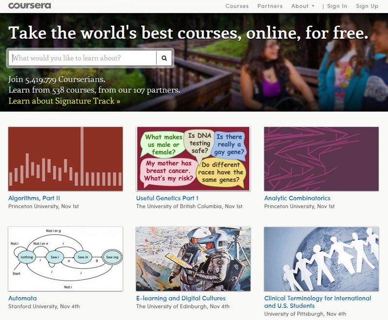 Mais de 5 milhões de participantes cursam algumas das aulas oferecidas pelo site gratuito Coursera, que tem mais de 500 programas cadastrados, de 100 instituições parceiras e em diferentes línguas (ainda que a grande maioria dos cursos seja mesmo em inglês, há opções até em português). A variedade de temas é bem abrangente, e os cursos podem durar semanas e têm acompanhamento de professores e profissionais.