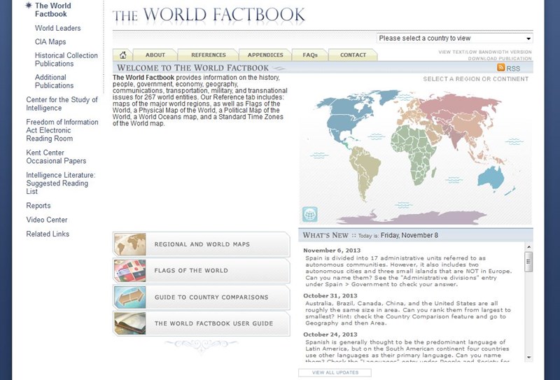 Esta página da CIA traz informações detalhadas de 267 entidades do globo, com dados sobre a história, a população, o governo, a economia, geografia, comunicação, transporte e relações internacionais das nações. O site contém mapas físicos e políticos, e há uma seção especial com curiosidades e comparações entre os países do mundo.