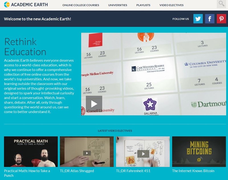 Academic Earth é um portal que agrega cursos online – gratuitos e em vídeo – de mais de 50 universidades do mundo. O site conta com uma seção de playlist com os vídeos mais interessantes e os tópicos mais fundamentais de ensino. Há também uma categoria de eletivas chamada “Video Electives” que traz não apenas informação, mas também um formato animado e divertido de assistir.