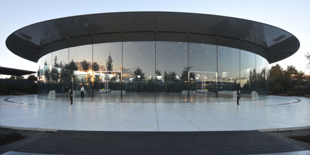 O Steve Jobs Theatre é a maior estrutura do mundo suportada apenas por vidro, onde seu teto, feito em fibra de carbono, pesa 80 toneladas.