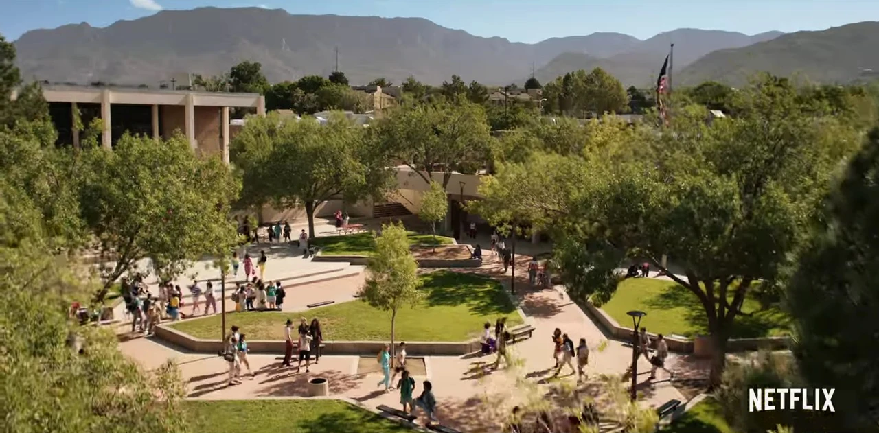 Netflix/Divulgação. Albuquerque representa a cidade fictícia de Lenora Hills, na Califórnia, onde a maior parte da 4ª temporada se passa. A escola escolhida foi a Eldorado High School e a equipe usou diferentes locações na cidade, como o Roller King e o Sawmill Market.
