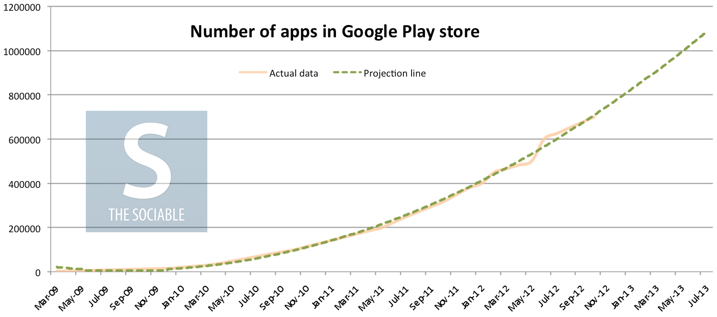 Atualmente, é sabido que a loja de aplicativos conta com cerca de 800 mil softwares cadastrados. O The Sociable acredita que a marca dos 900 mil programas deve ser atingida antes de abril – e que a Google Play ultrapassará 1 milhão de apps em junho de 2013.