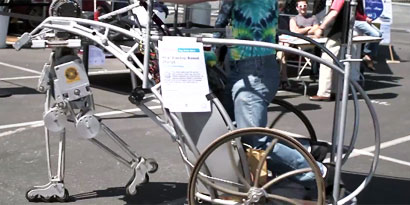 Quem passou pela Maker Faire Bay Area 2011 provavelmente se deparou com essa cena inusitada: uma estranha charrete totalmente feita em metal sendo puxada por um robô bípede de capacete que parece estar andando de patins. Essa bizarra criação é fruto da mente de Bob Scheneeveis, um mecânico que trabalha há 25 anos com veículos elétricos que causem pouca poluição ao meio ambiente.