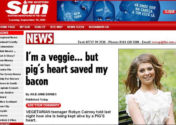A jovem Robyn Cairney, de apenas 18 anos, foi salva graças ao transplante de um coração suíno. Ela teve uma válvula cardíaca de um porco implantada em seu próprio órgão, o que estabilizou sua corrente sanguínea.