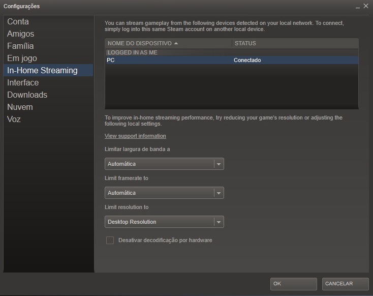 Feito isso, basta realizar o login de sua conta em duas máquinas diferentes conectadas à mesma rede local. Para conferir se tudo ocorreu conforme o esperado, entre novamente no painel de ajustes do programa e confira a existência do campo “In-Home Streaming”, que não só mostra os computadores autorizados a lidar com sua conta como permite ajustar limites de transmissão de dados e limitar a resolução de exibição dos games reproduzidos em outras máquinas.